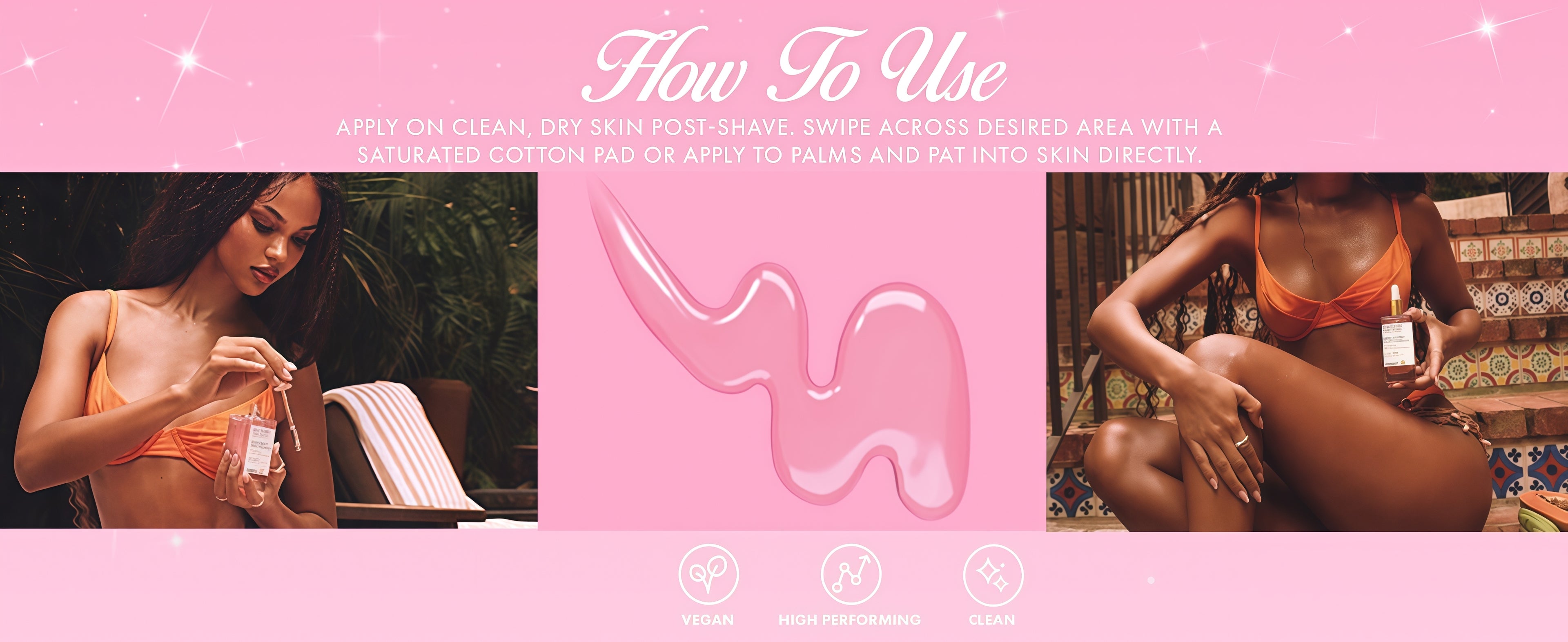 Apply a few drops to clean, dry skin immediately after shaving. You can use it on legs, underarms, bikini line, chest, or face. Simply pat or swipe onto skin with your palms or a cotton pad.